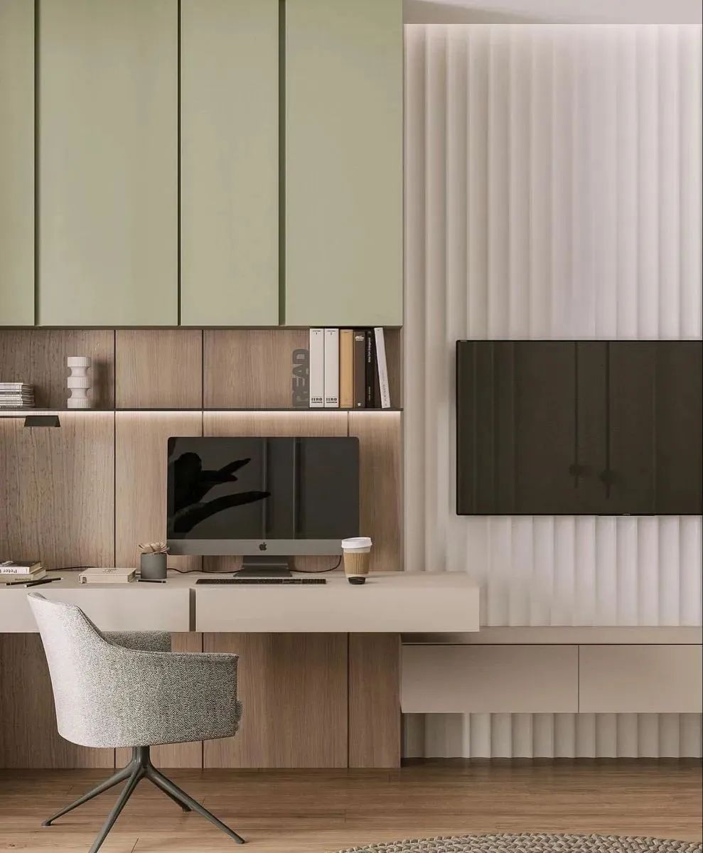 Níl obair ón mbaile neamhchoitianta a thuilleadh. Do theaghlaigh atá ag gabháil do indibhidiúlacht agus do réitigh spáis, is féidir deasca a oiriúnú go lárnach le cáis leabhar agus le caibinéid taispeána. Ní áitíonn an dearadh sleek spás.