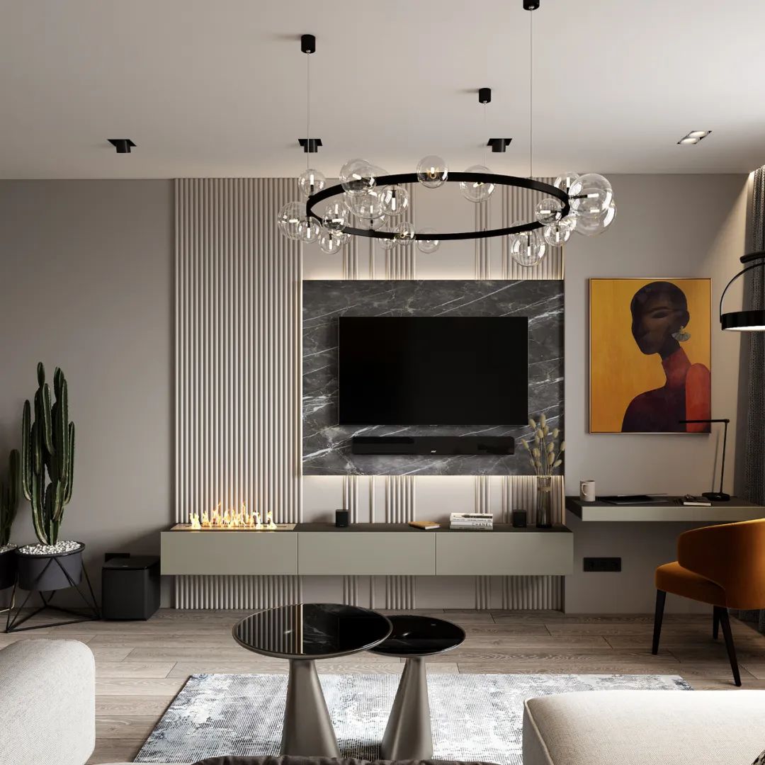 Níl an dearadh ar fionraí teoranta do chaibinéid. Is rogha coitianta é balla teilifíse ar fionraí a fhreastalaíonn mar roinnteoir spásúil ar an lá seo, ag cur elegance leis an mbaile.