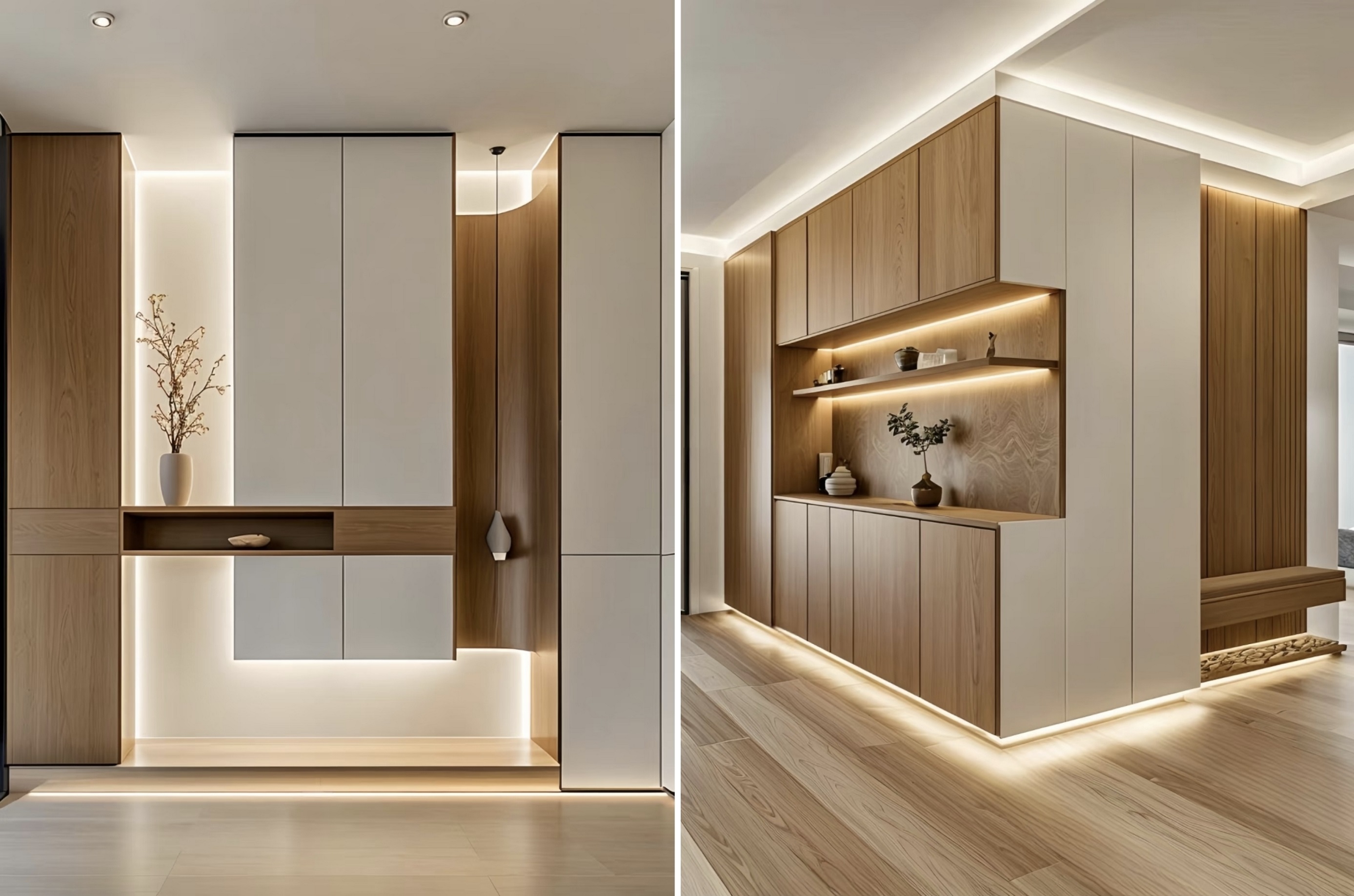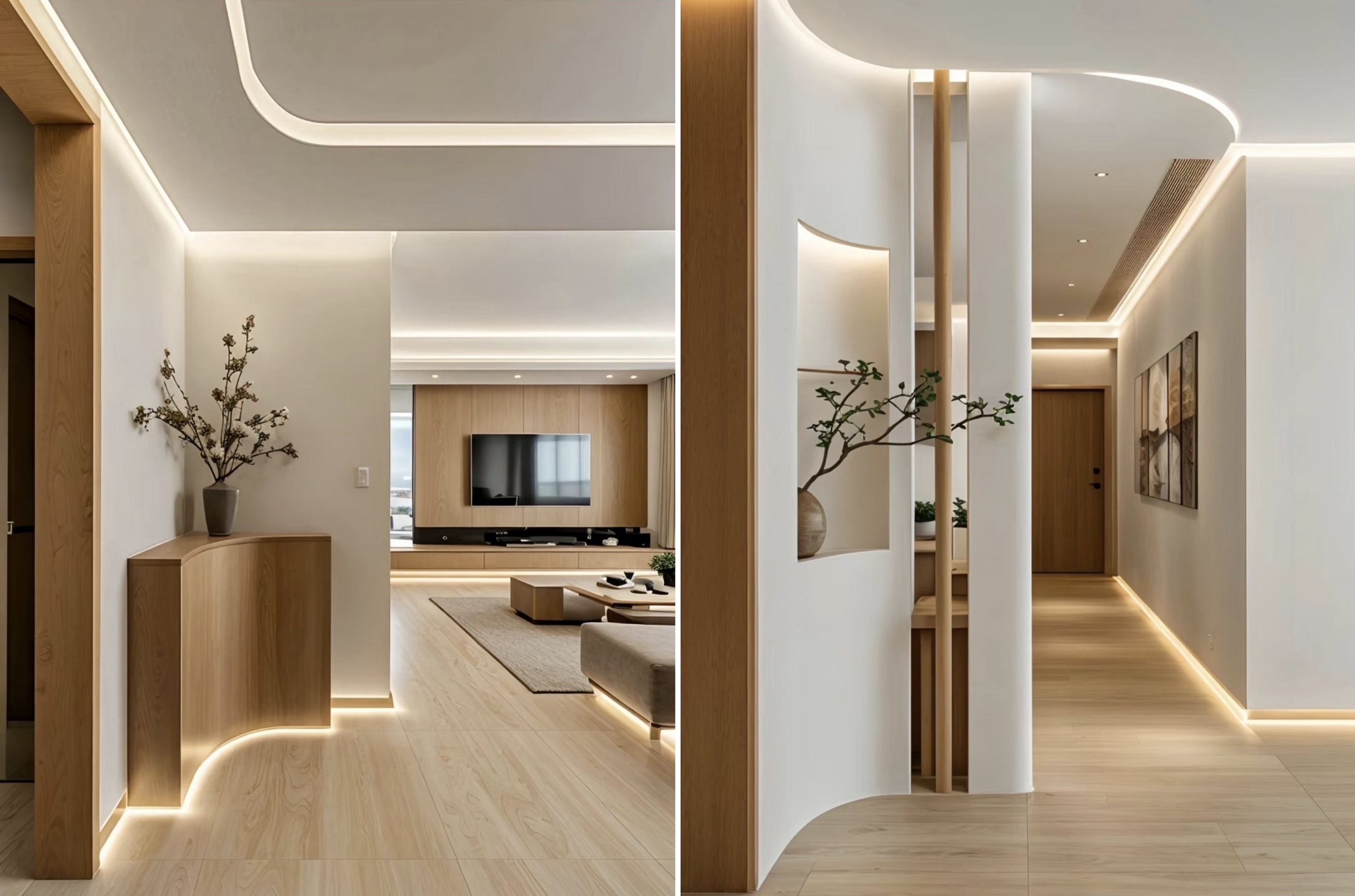 Tá dearadh cuartha le balla bréifneach ar an mbealach isteach a thugann solas nádúrtha isteach.